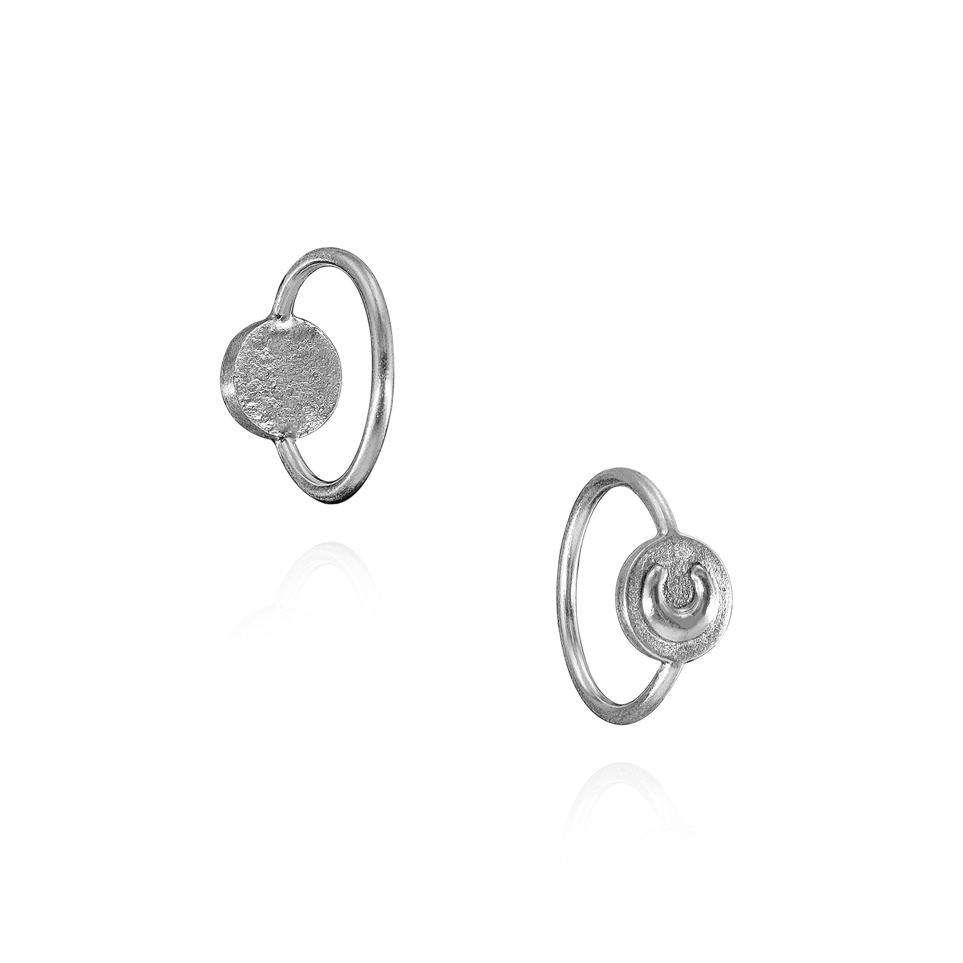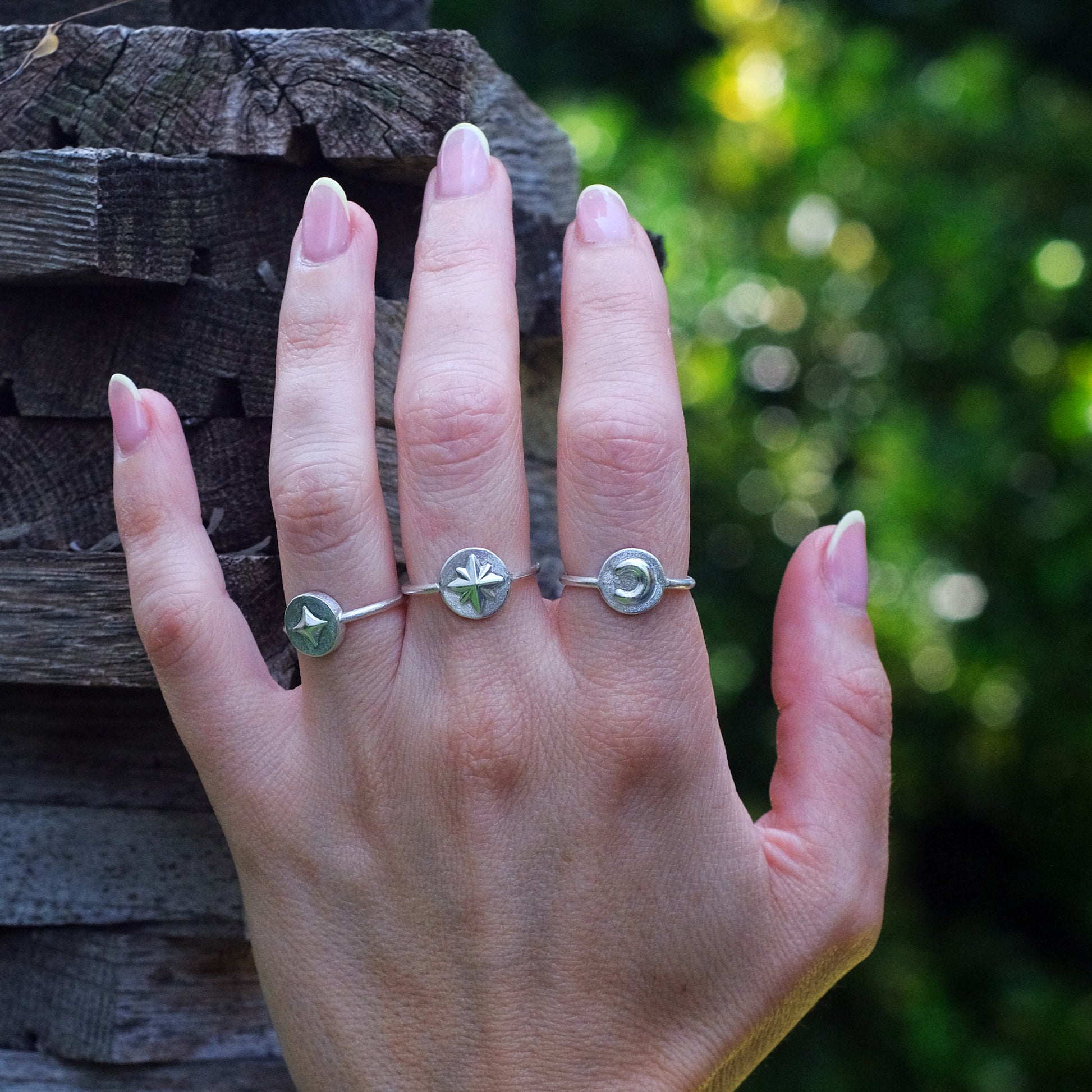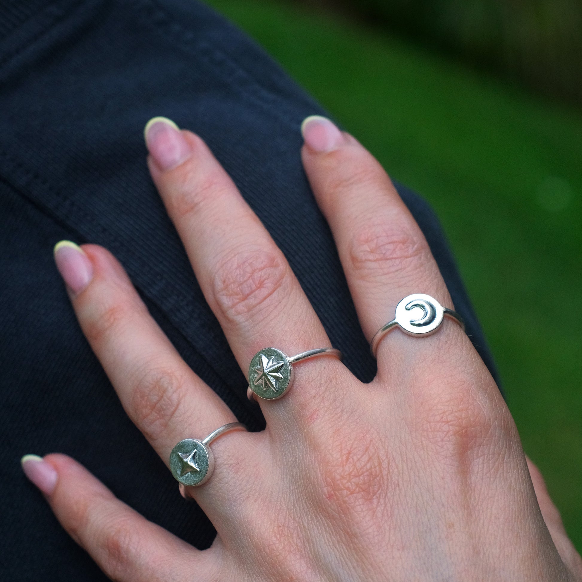 Handcrafted from recycled sterling silver using traditional forging techniques, the ring features a clean, rounded band with a crescent moon stamped onto a softly elevated circular face. Each surface is hand-hammered, creating a textured finish that reflects process, energy, and transformation.